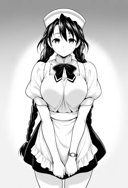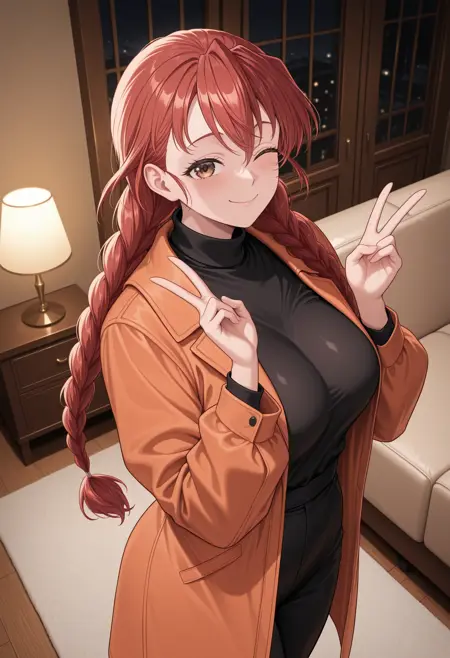 takeke, 1girl,red hair,long hair,twin braids,brown eyes,large breasts,