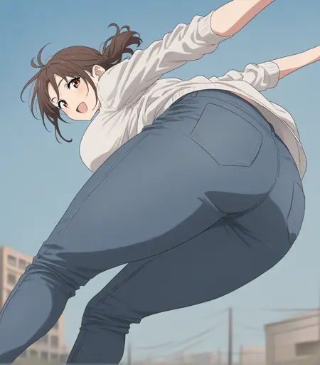 hip attack, pov, jumping, ass focus, from behind, looking back, outstretched arms, outstretched legs
