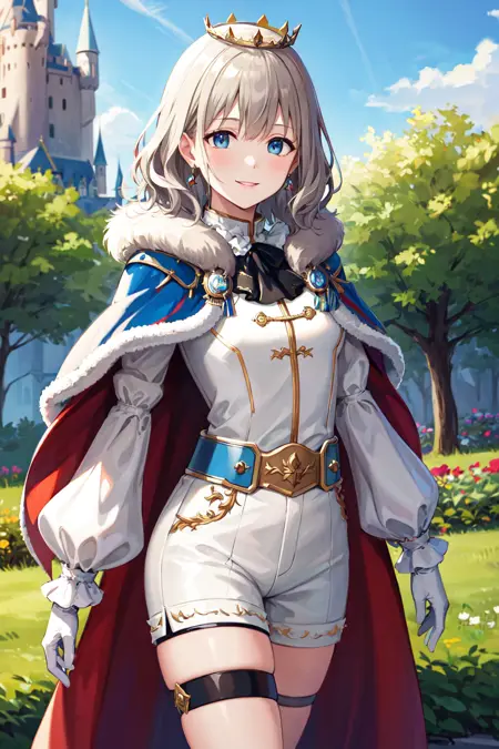 outfit5eeasahi, medium hair, crown, earrings, fur trim, cape, frilled shirt, long sleeves, frilled sleeves, white gloves, white shorts, belt, thigh strap