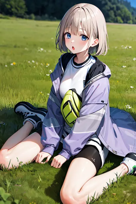 outfit2bbasahi, short hair, off shoulder, white shirt, purple jacket, open jacket, long sleeves, sleeves past wrists, fanny pack, black shorts
