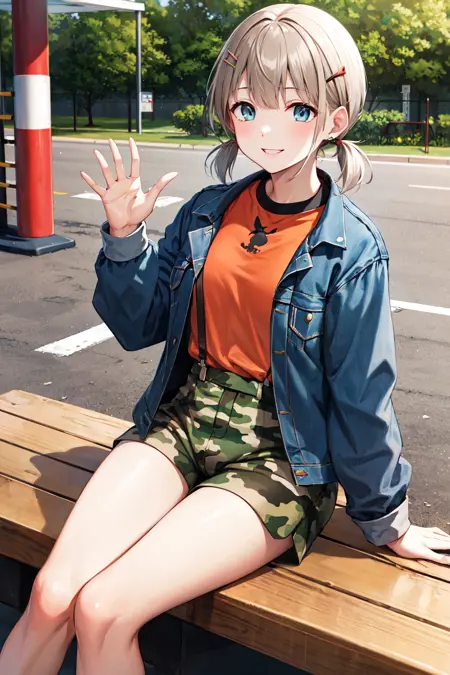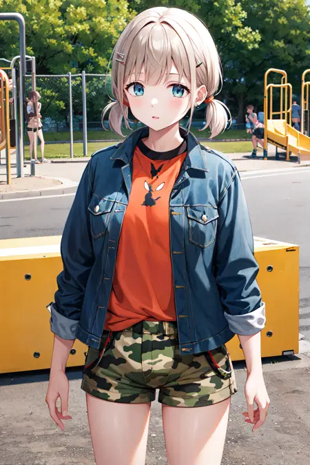 outfit3ccasahi, short hair, short twintails, low twintails, hairclip, earrings, orange shirt, suspenders, denim jacket, open clothes, long sleeves, green shorts, camouflage
