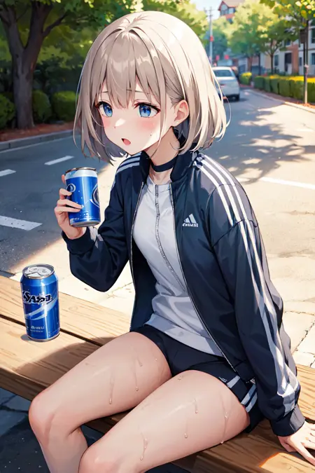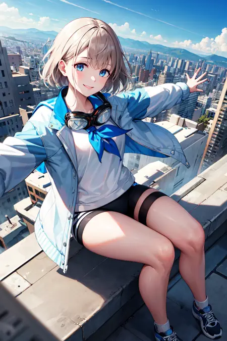 outfit6ffasahi, short hair, goggles around neck, sailor collar, blue neckerchief, white shirt, blue jacket, open jacket, long sleeves, black shorts