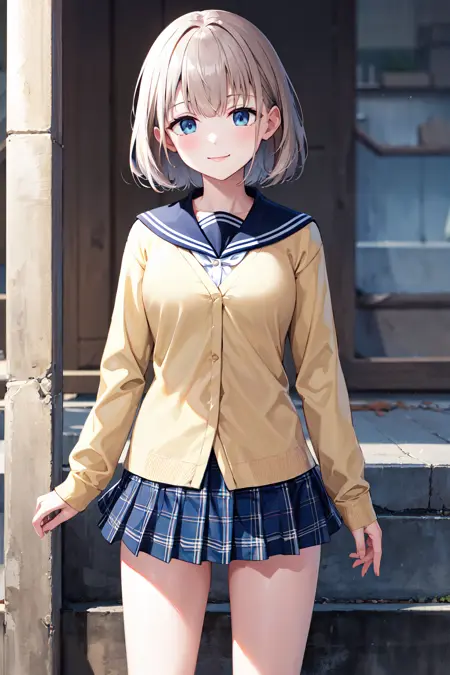 outfit1aaasahi, short hair, blue sailor collar, yellow cardigan, long sleeves, plaid skirt, blue skirt