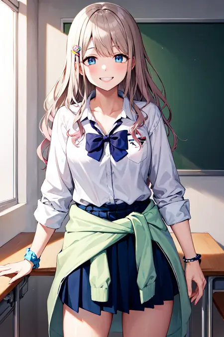 outfit8hhasahi, long hair, wavy hair, hair ornament, gyaru, collarbone, bow, loose bowtie, white shirt, collared shirt, long sleeves, bracelet, wrist scrunchie, clothes around waist, blue skirt, pleated skirt