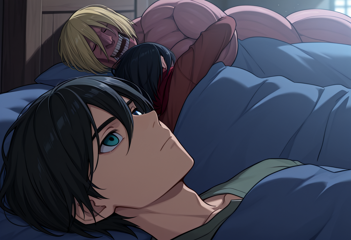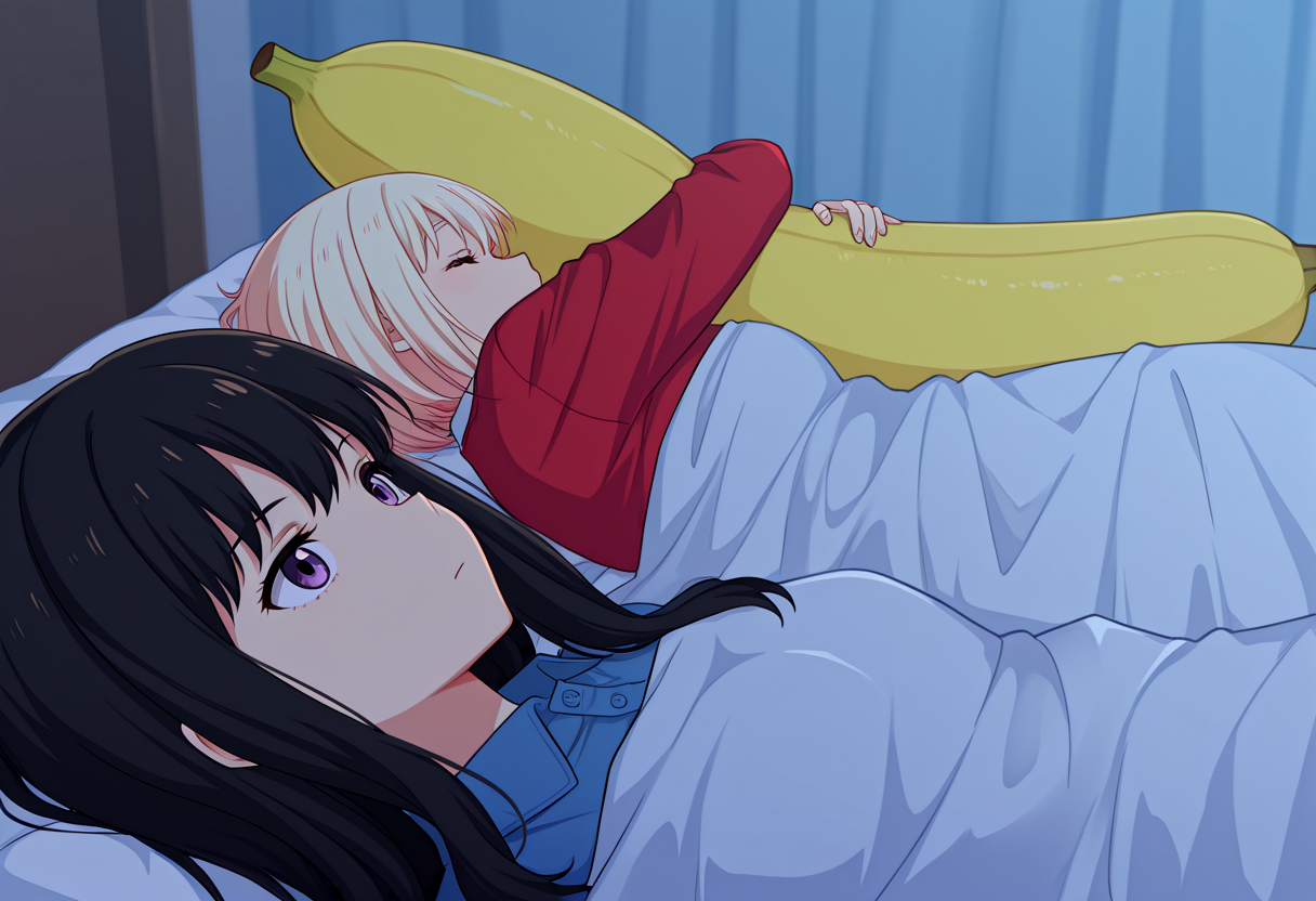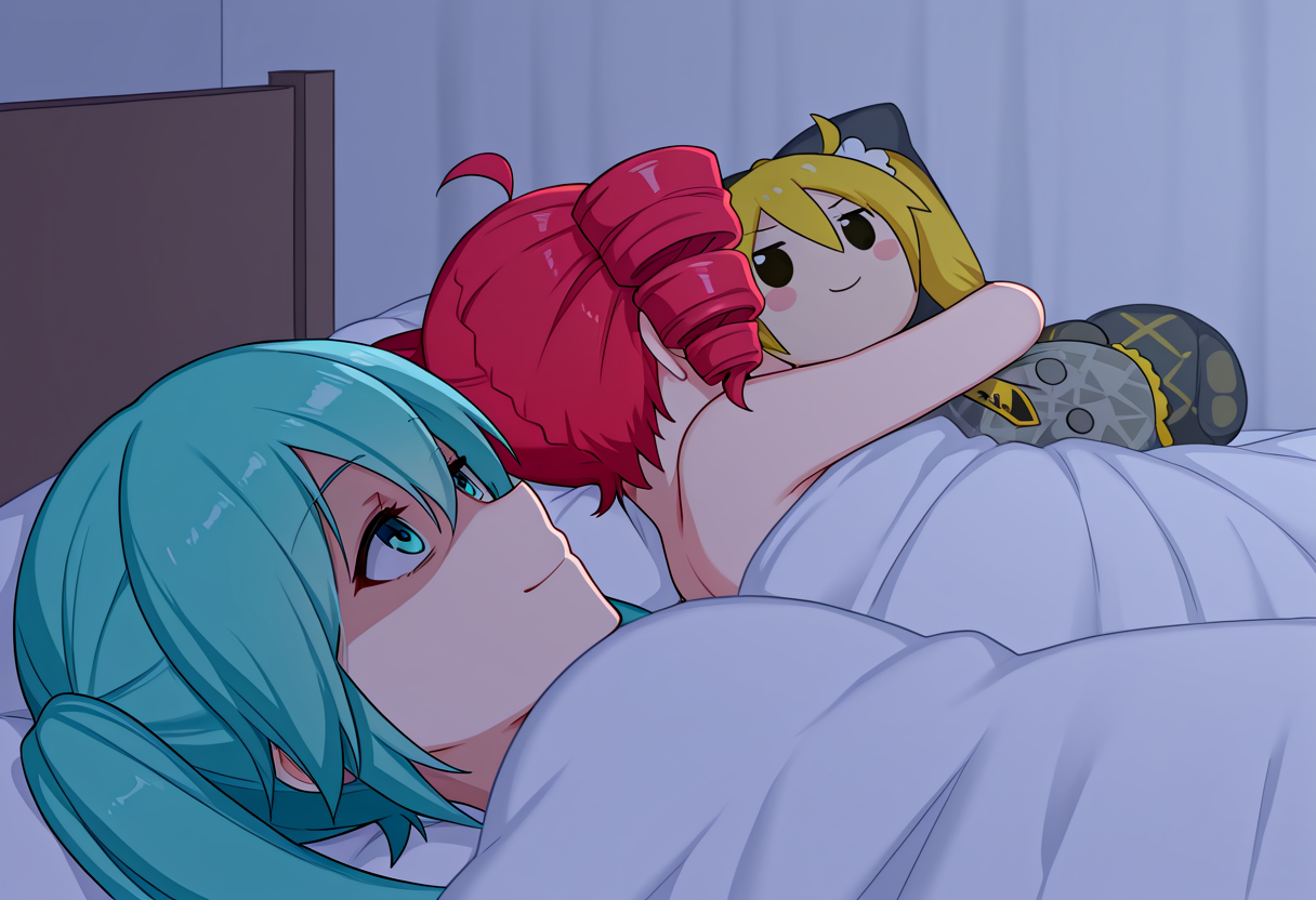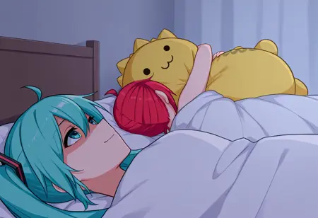 トリガー語: 500_dollar_four_foot_tall_mareep、ベッドの上、毛布の中、物を抱きしめる、