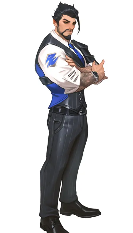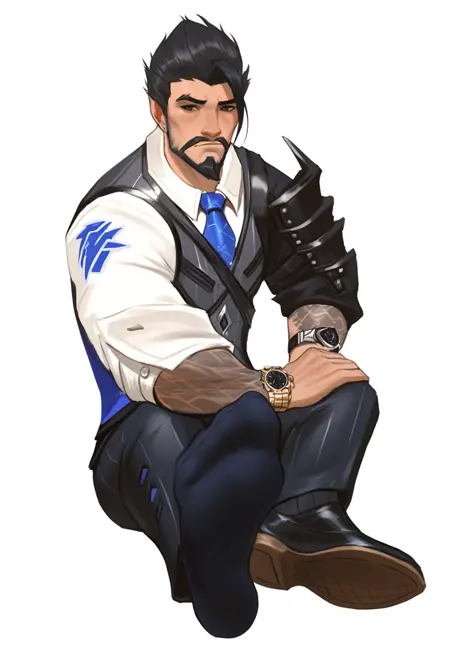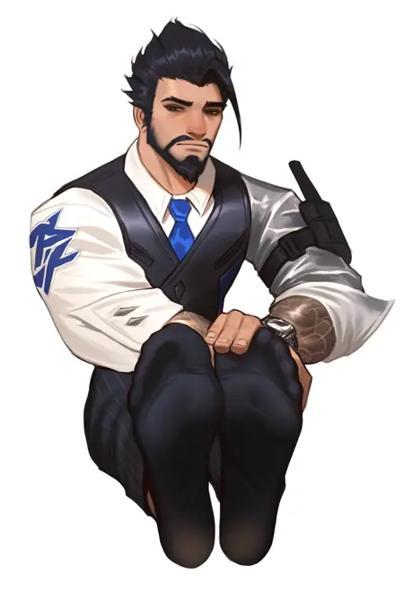 Prompts: scionhanzo,1boy,mature male,facial hair,short hair,vest,white shirt,blue necktie,black pants,leather shoes,