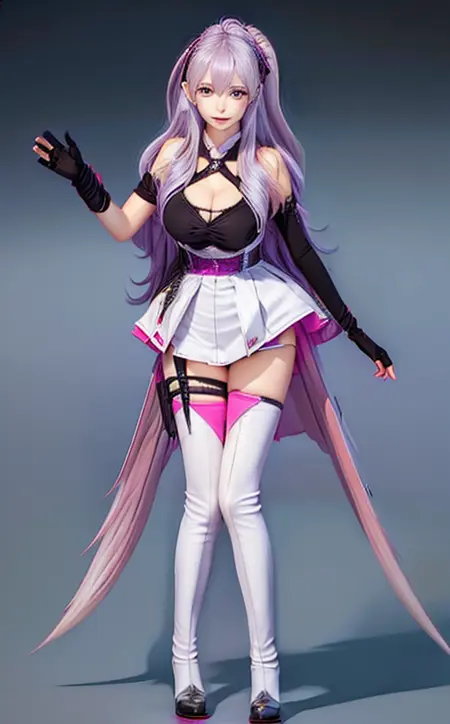 | トレーニングワード | Kanami, 1girl, solo, gloves, thighhighs, white hot pants, breasts, long hair, fingerless gloves, blue eyes, full body, multicolored hair, cleavage, looking at viewer, white skirt, white thighhighs, streaked hair, smile, virtual youtuber, pink hair, standing, asymmetrical gloves, open mouth, bangs, holster, boots, purple hair, headset, bare shoulders, waving, hair between eyes, elbow gloves, thigh boots コピーしました! |