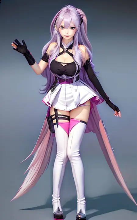 | 训练词汇 | Kanami, 1girl, solo, gloves, thighhighs, white hot pants, breasts, long hair, fingerless gloves, blue eyes, full body, multicolored hair, cleavage, looking at viewer, white skirt, white thighhighs, streaked hair, smile, virtual youtuber, pink hair, standing, asymmetrical gloves, open mouth, bangs, holster, boots, purple hair, headset, bare shoulders, waving, hair between eyes, elbow gloves, thigh boots 已复制! |