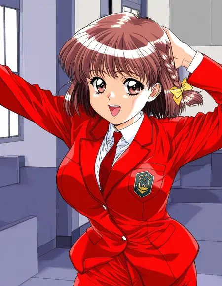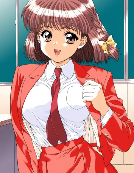 Sugita_Chisato(CanCanBunny_Extra), 1girl, solo, 棕色头发, 短发, 单马尾, 棕色眼睛, 头发蝴蝶结, 黄色蝴蝶结, 大乳房,