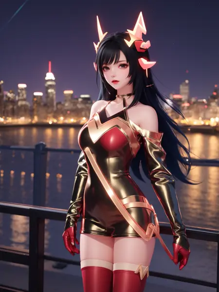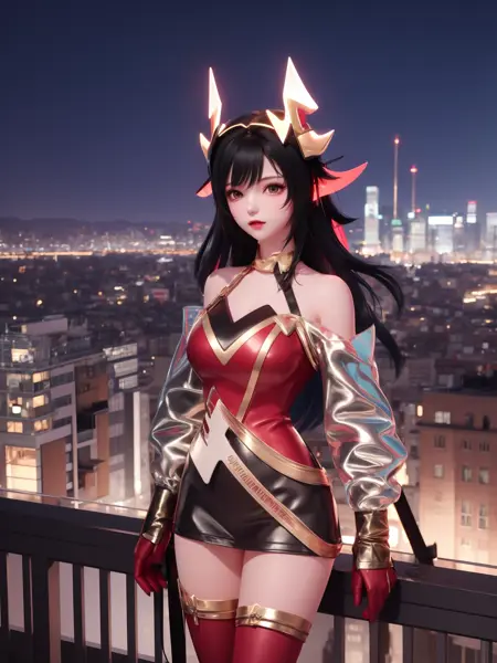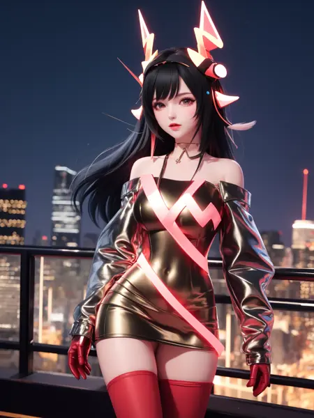 - WZRYyaoZWHZ, 1girl, solo, thighhighs, long hair, red gloves, looking at viewer,short dress, bare shoulders,lips, gradient, see-through,cityscape, night, hand on hip, mature female, cowboy shot, animal ears,