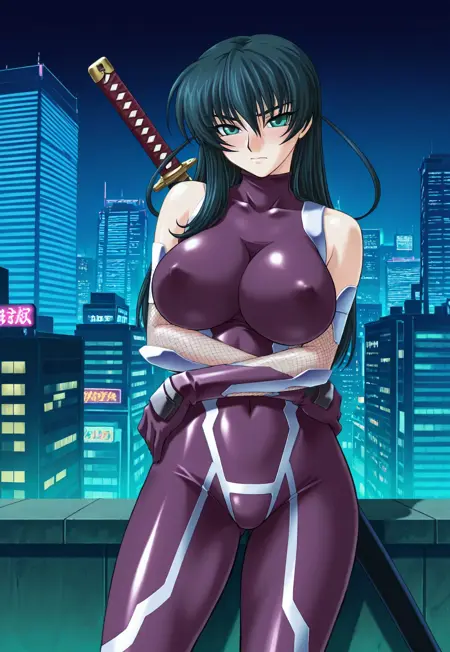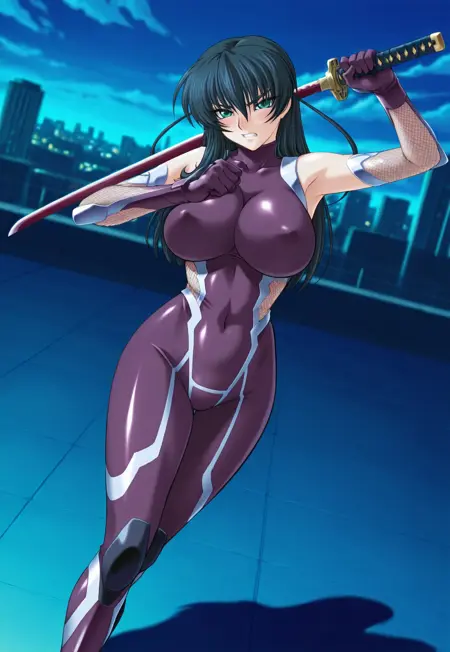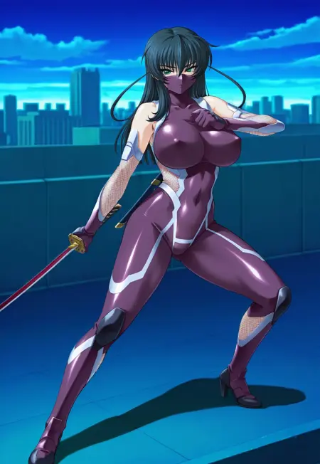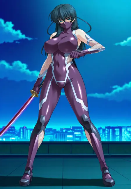 1번 의상: 젖꼭지 가림, 타이마닌 복장, 닌자, 보라색 바디수트, 꼭 맞는, 어깨 노출, 피쉬넷, 장갑, 하이힐