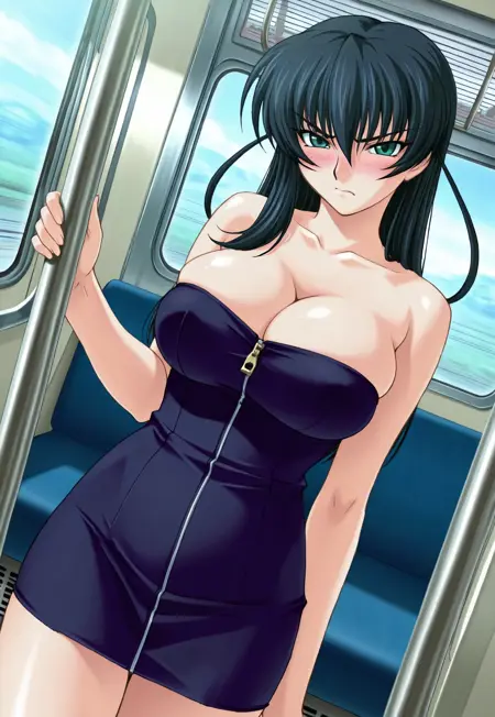 3번 의상: 돌출된 가슴, 가슴 틈, 진한 파란 드레스, 스트랩리스, 진한 지퍼