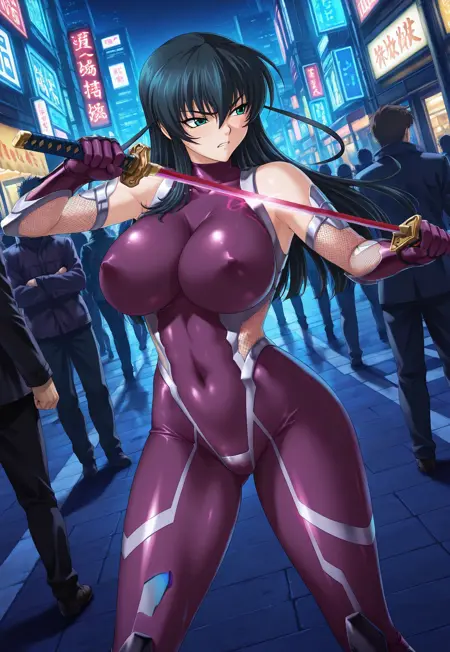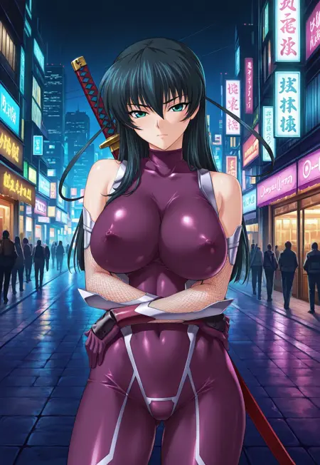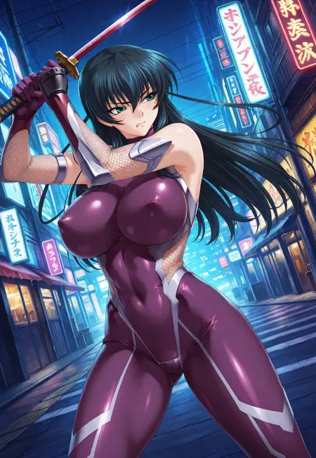1st outfit: covered nipples, taimanin suit, ninja, purple bodysuit, skintight, bare shoulders, fishnets, gloves, high heels