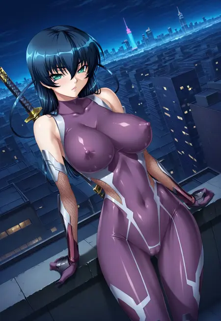 1번 의상: 젖꼭지 가림, 타이마닌 복장, 닌자, 보라색 바디수트, 꼭 맞는, 어깨 노출, 피쉬넷, 장갑, 하이힐