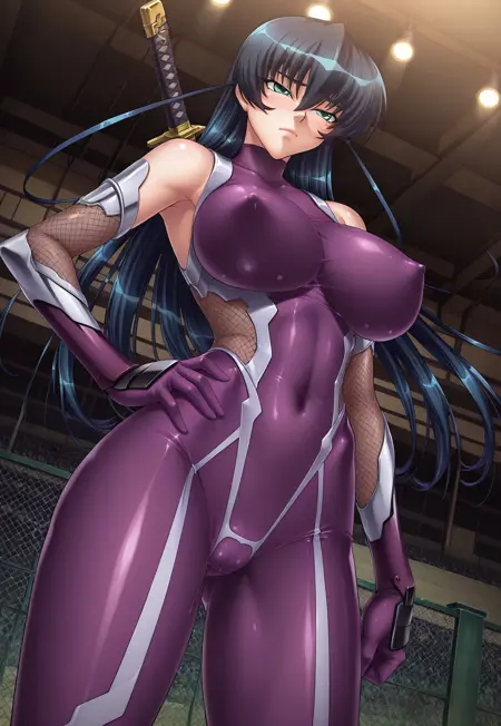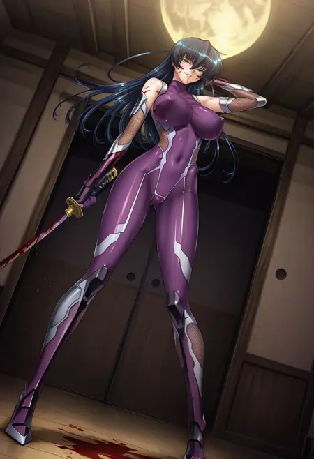 第一套服装:乳头被遮盖、泰摩宁制服、忍者、紫色紧身衣、紧身、裸露肩膀、渔网袜、手套、高跟鞋