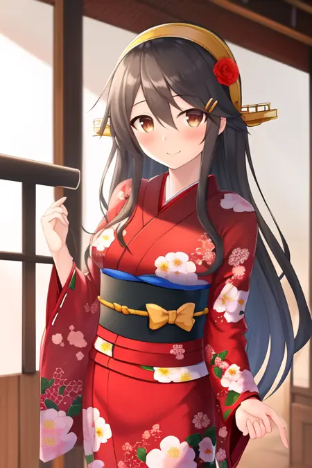 The trigger word is haruna_kantaicollection, and the recommended tags are best quality, masterpiece, highres, solo, {haruna_kantaicollection:1.15}, black_hair, long_hair, hair_ornament, hairband, brown_eyes, hairclip, blush, smile, headgear, breasts, nontraditional_miko, hair_between_eyes.
