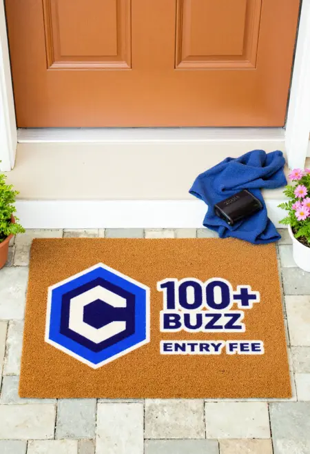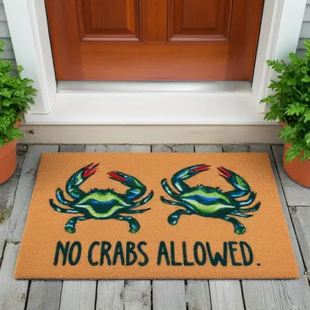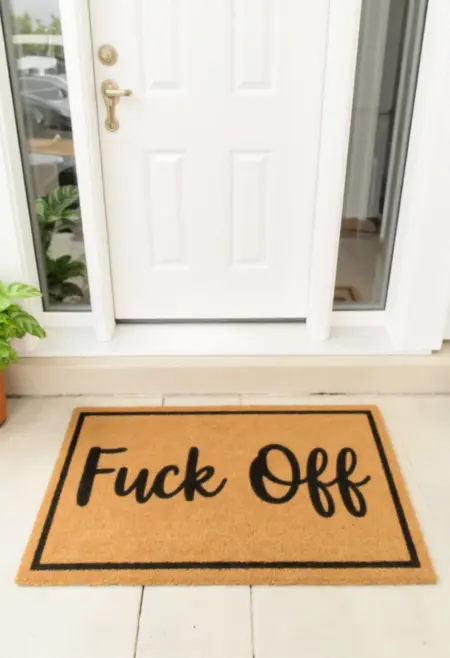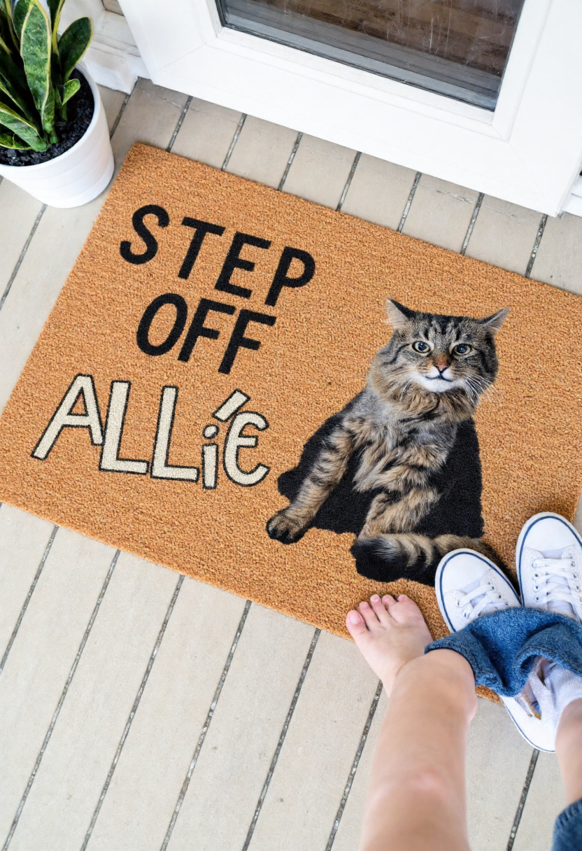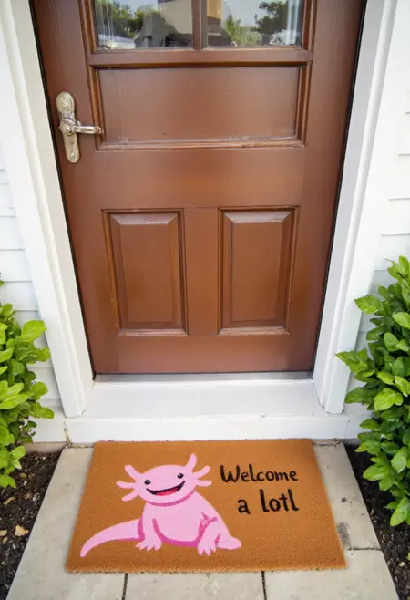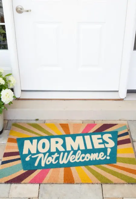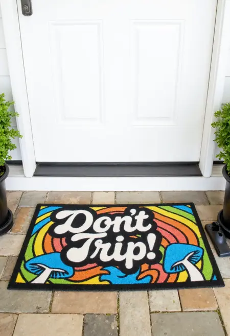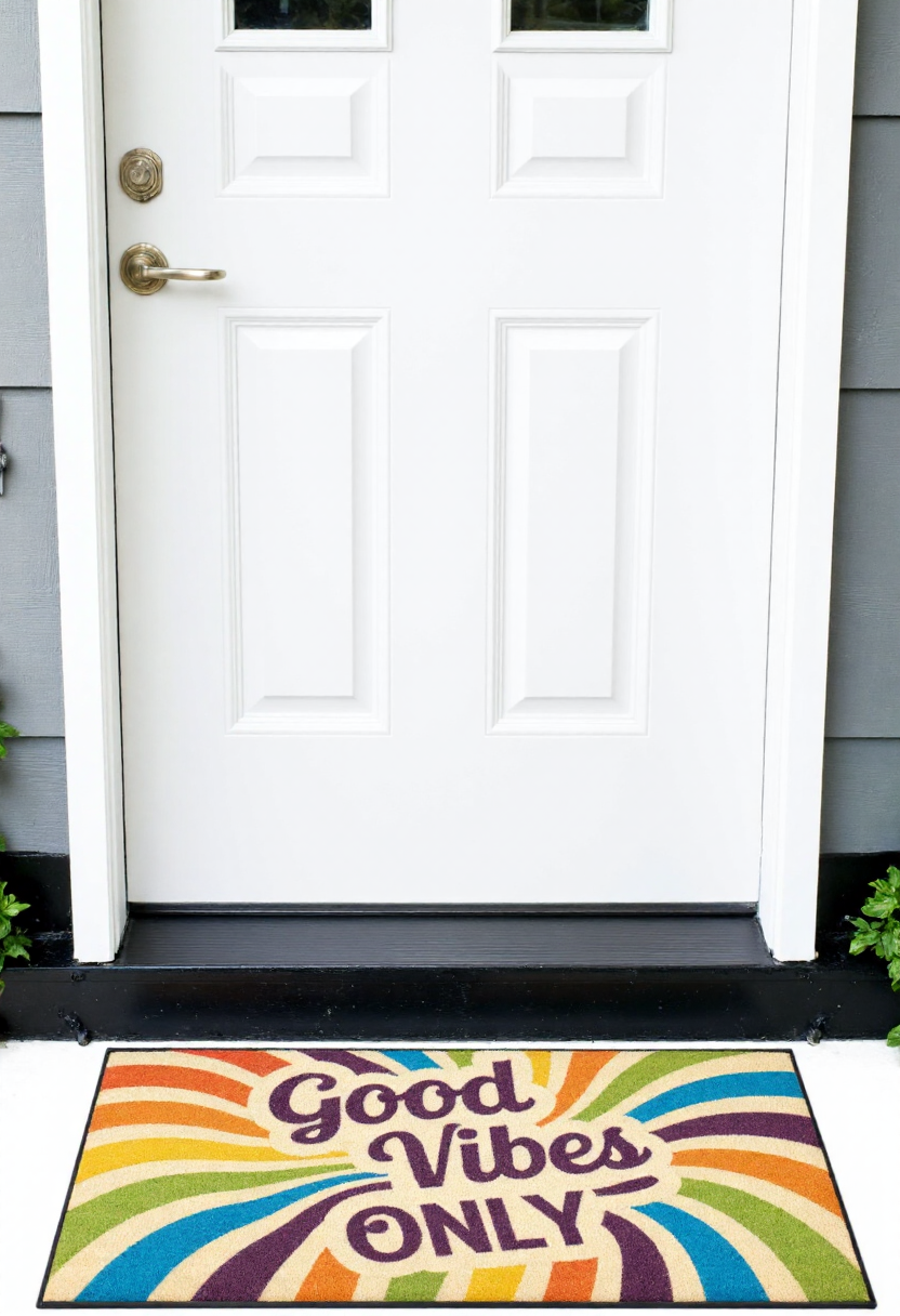 - 前扉の前に置かれた、カラフルなウェルカムマットの写真。マットには、太字の白い大文字で「(TEXT)」というフレーズが描かれている。