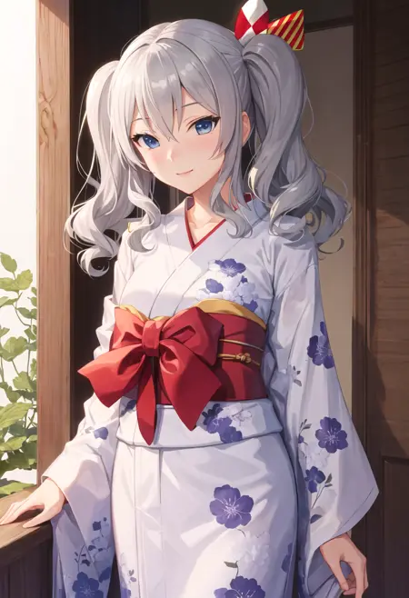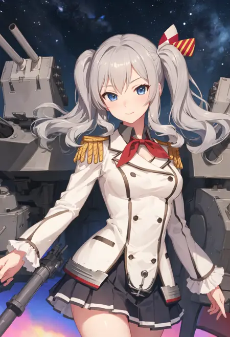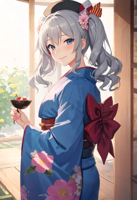触发词是 kashima_kantaicollection,精简标签为 twintails, grey_hair, wavy_hair, blue_eyes, breasts, long_hair, hat, large_breasts, beret。当某些特征(如发色)有时不够稳定时,你可以在提示词中加入这些标签。