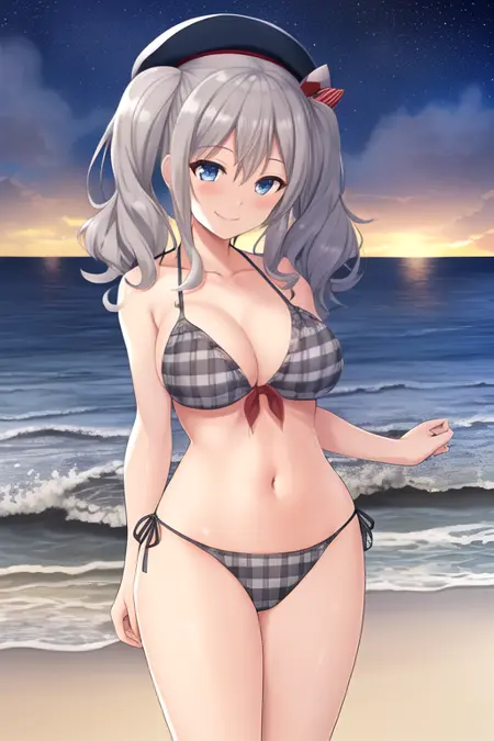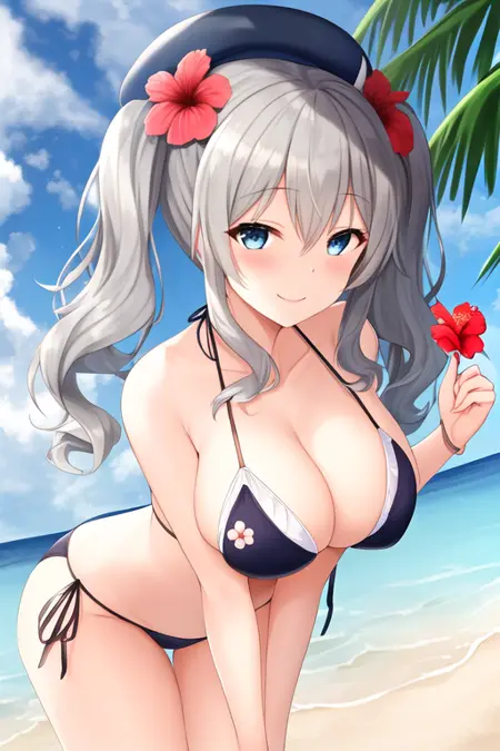 The trigger word is kashima_kantaicollection, and the pruned tags are twintails, grey_hair, wavy_hair, blue_eyes, breasts, long_hair, hat, large_breasts, beret. When some features (e.g. hair color) are not so stable at some times, you can add these them into your prompt.