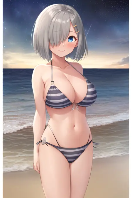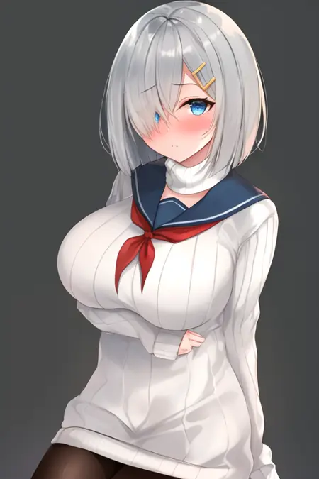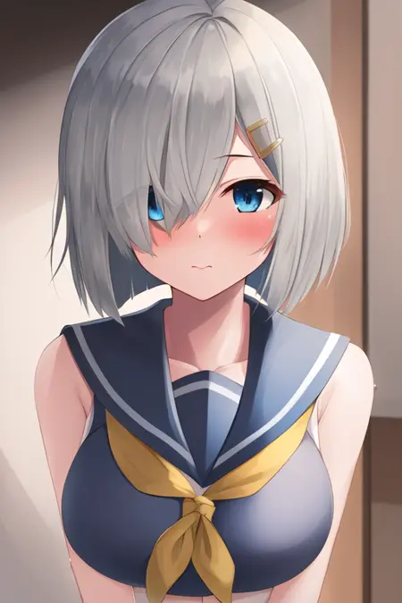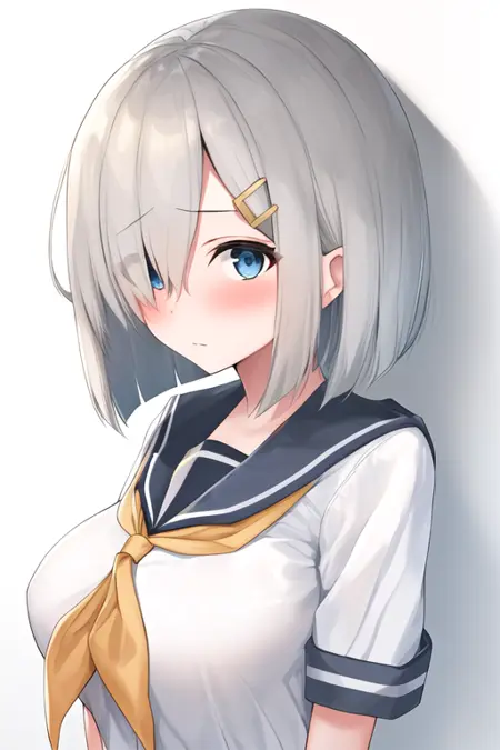 - 축소된 캐릭터 태그는 short_hair, blue_eyes, grey_hair, hair_ornament, hairclip, hair_over_one_eye, breasts, large_breasts입니다. 캐릭터의 핵심 특징(예: 머리 색상)이 안정적이지 않을 때 이 태그들을 프롬프트에 추가할 수 있습니다.
