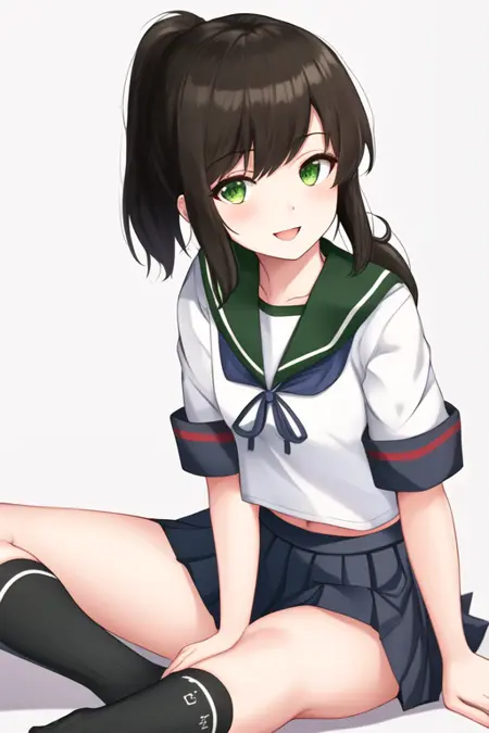 触发词为 fubuki_kantaicollection,推荐标签为:best quality, masterpiece, highres, solo, {fubuki_kantaicollection:1.15}, black_hair, ponytail, short_ponytail, serafuku, sidelocks, low_ponytail, smile, green_eyes, open_mouth, blush。