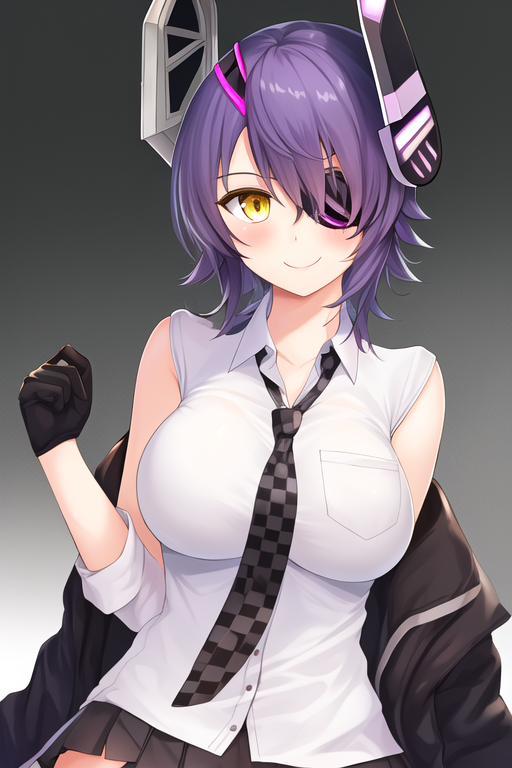 The trigger word is tenryuu_kantaicollection, and the recommended tags are best quality, masterpiece, highres, solo, {tenryuu_kantaicollection:1.15}, eyepatch, short_hair, purple_hair, yellow_eyes, headgear, breasts, necktie, large_breasts, smile.