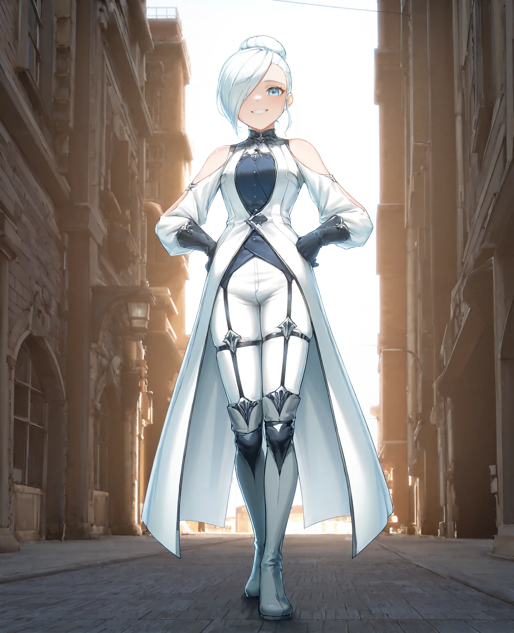 外观: W1nt3r,1girl,蓝眼睛,白发,头发遮住一只眼睛,单发髻