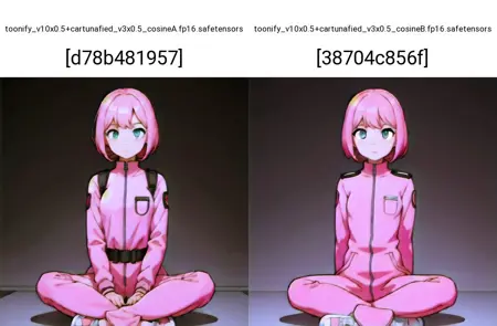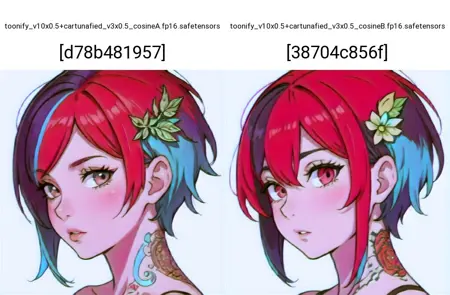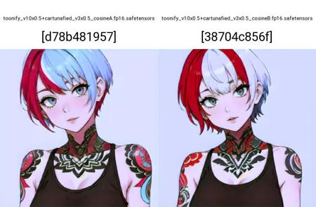 这是一个在 toonify_v10 和 cartunafied_v3 之间进行的 50% 余弦合并,生成的图像色彩褪色,让我想起在 CRT 电视 上播放的旧卡通。模型 A 和 B 是相同的合并,分别使用 cosineA 或 cosineB。A 生成的图像稍显复杂,B 生成的图像则更可爱一些。两者都相当稳定。