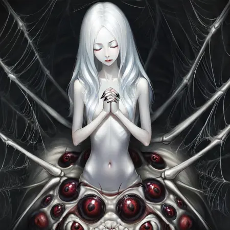 WFairlady, white hair, hair censor, closed eyes, white skin, long black nail, spiky fingernail, praying, arthropod girl, spider girl, arachne, half spider, white spider legs, solo, 1girl
