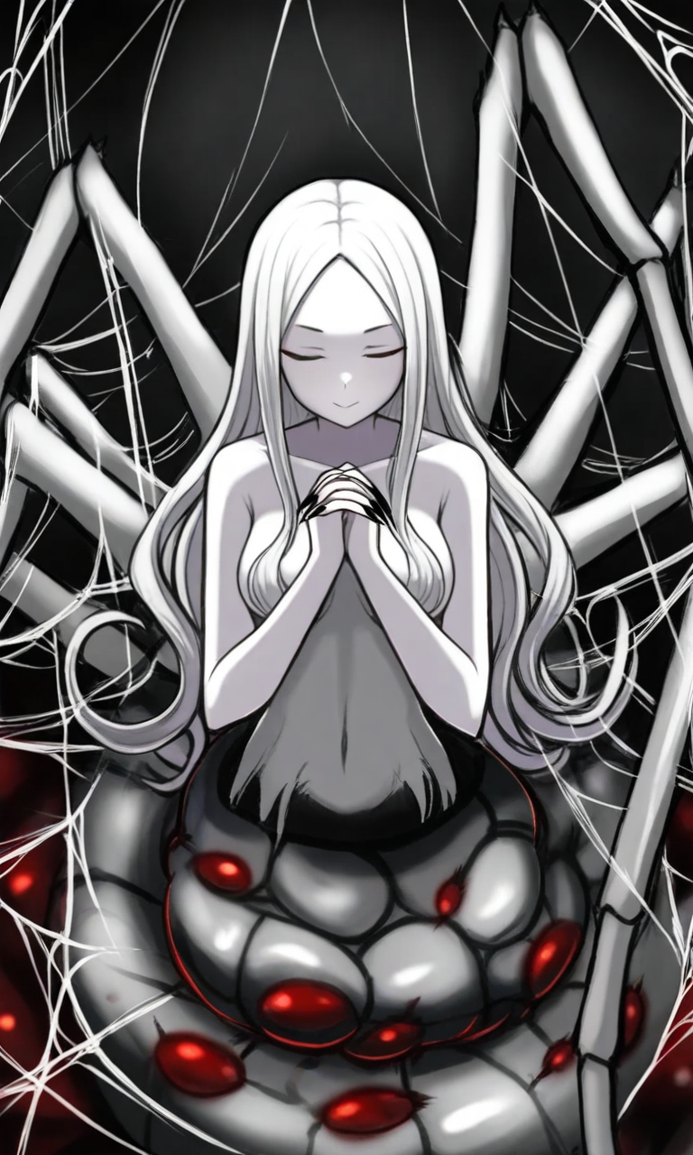 WFairlady, white hair, hair censor, closed eyes, white skin, long black nail, spiky fingernail, praying, arthropod girl, spider girl, arachne, half spider, white spider legs, solo, 1girl
