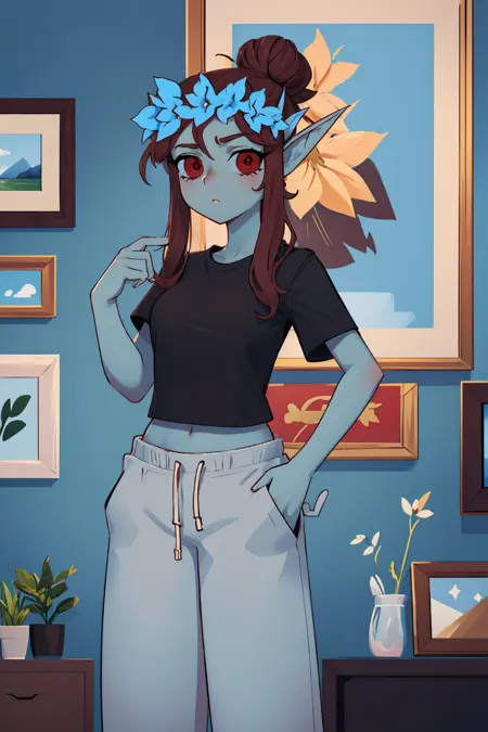 • 衣装タグ: 青い肌、尖った耳、黒いシャツ、髪の結び目、ズボン、赤い白目、髪の花