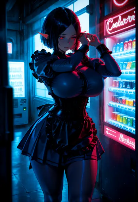 1girl, 暗精灵, 尖耳朵, 红眼睛, 短发, 分开的刘海, 波波头, 黑发, 巨乳, (粗大腿:1.3), 宽臀,