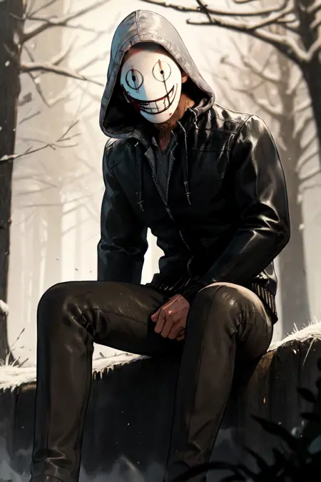 "LegionFrank, mask, black jacket, hoodie, hood up, pants"