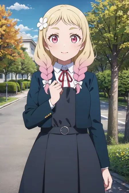 필요한 태그: 1girl, solo, onitsuka natsumi, blonde hair, pink eyes, gradient hair