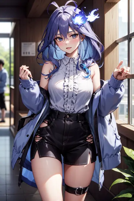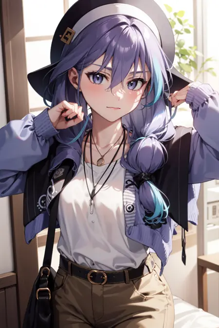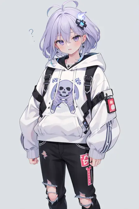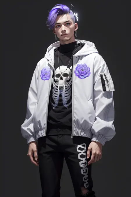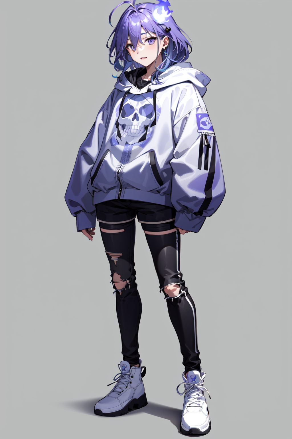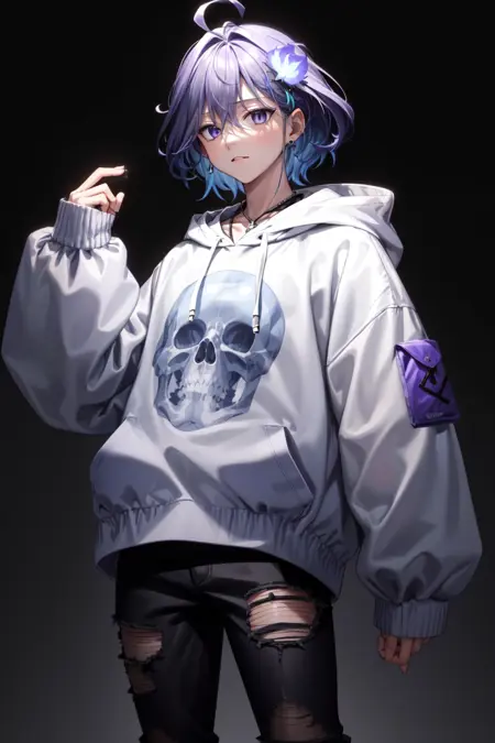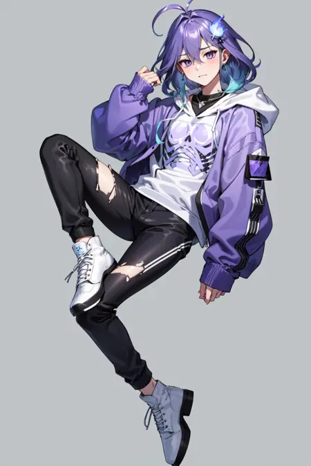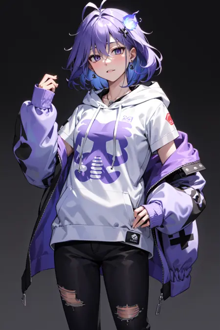 주요 의상에는 다음 태그들이 도움이 됩니다: 흰색 신발, 전체 몸, 부츠, 찢어진 옷, 검정 셔츠, 검정 바지, 보라색 눈, 찢어진 바지, 후드, 재킷, 손목을 넘는 소매, 머리 장식, 긴 소매, 뼈 무늬, 안테나 머리카락, 양말, 볼륨 있는 긴 소매, 신발, 장신구, 꽃, 허리 가방, 히토다마, 후드 재킷, 귀걸이, 십자 끈 신발
