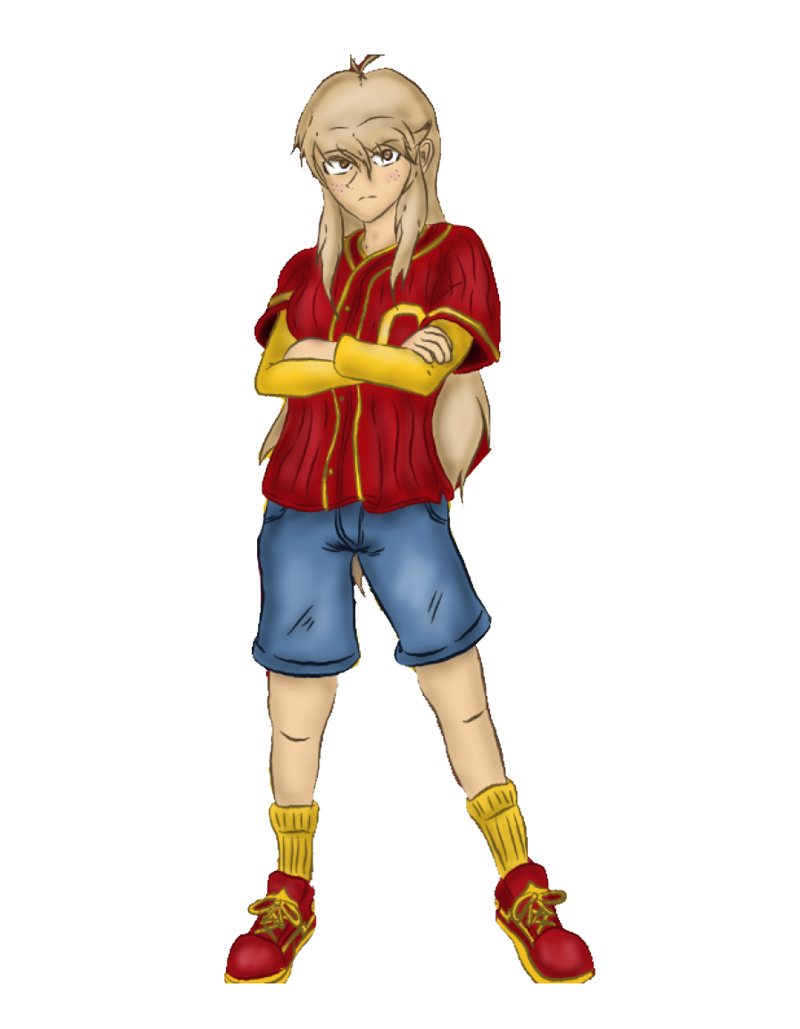 샌디 블론드 헤어, 주근깨, 뾰족한 코, 빨간 티셔츠, 빨간 반바지, 빨간 스니커즈