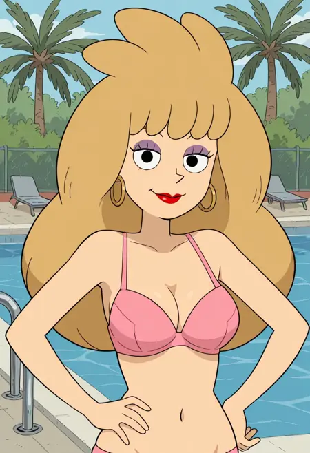 1girl, solo, Tinona_C, 白皙皮肤, 黑色眼睛, 金色头发, 长发, 蓬松 voluminous 头发, 金色圆环耳环, 红色口红, 紫色眼影