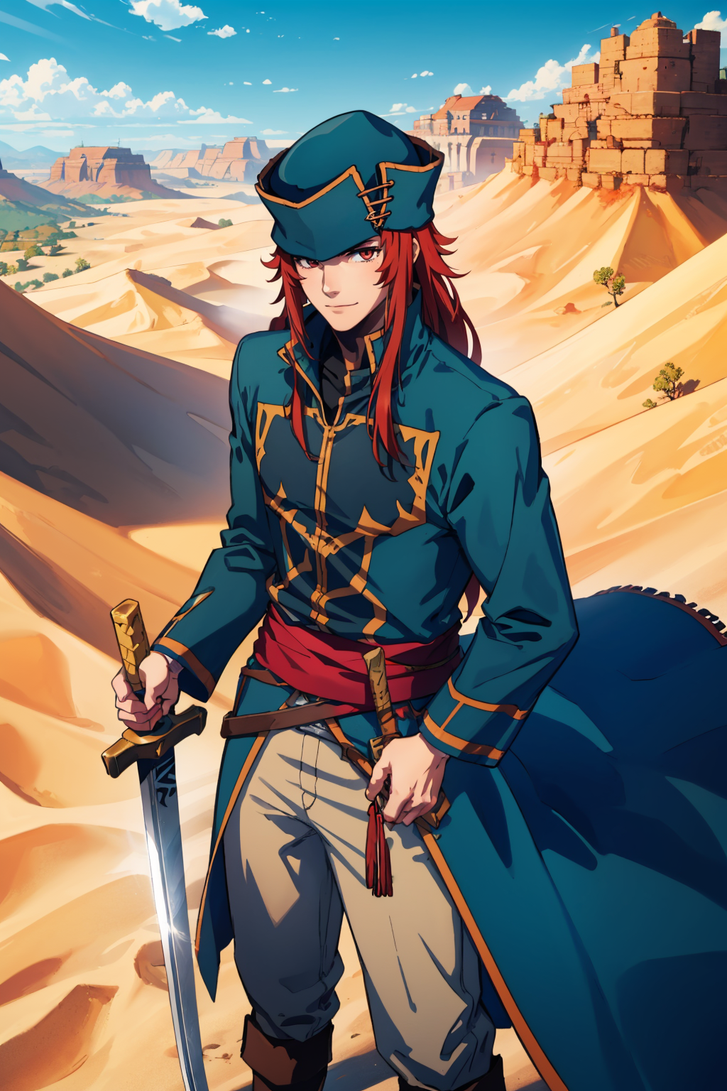 Add "defJoshua, 1boy, hat, black coat, sash, pants" for his regular appearance.