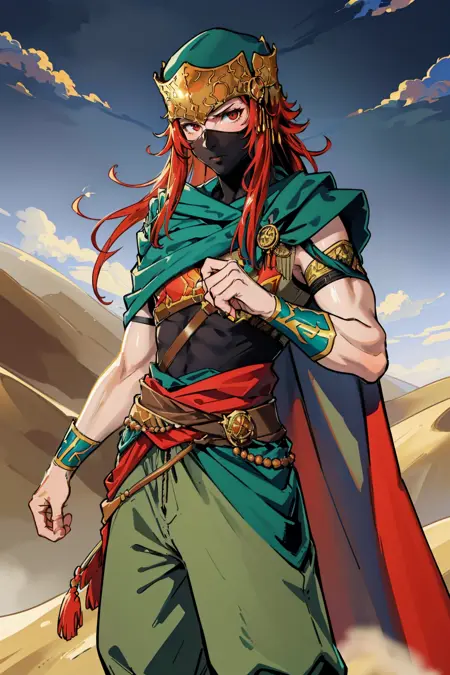 Add "ascJoshua, 1boy, mask, turban, green cape, armor, green pants, clothes around waist" for Ascended Joshua.