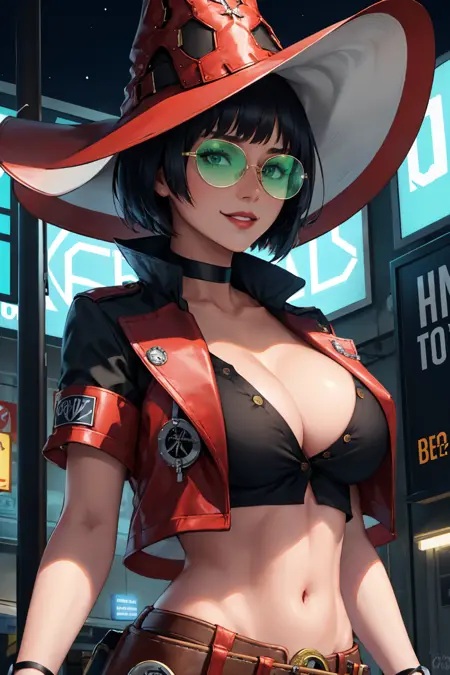Strive 스타일을 원할 경우 "striveIno, hat, choker, tinted eyewear, red jacket, short sleeves, black shirt, midriff, belt, fingerless gloves, thigh boots"를 추가하세요.