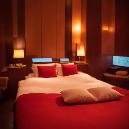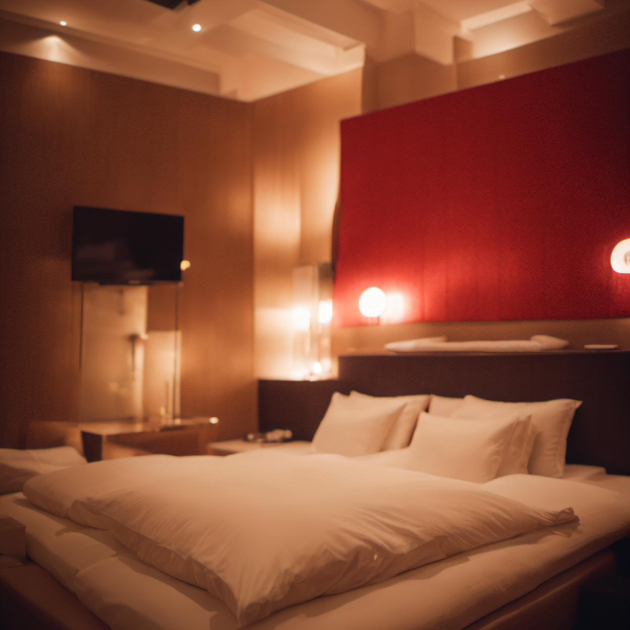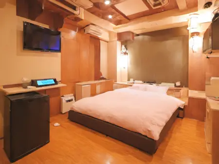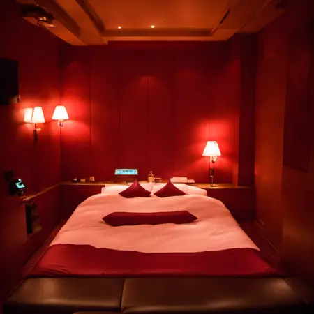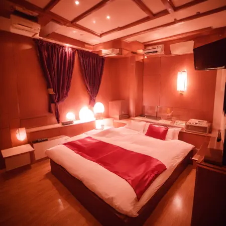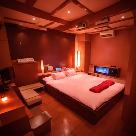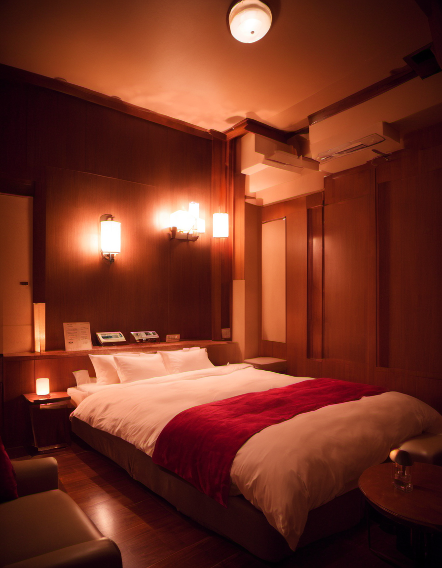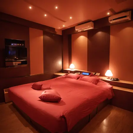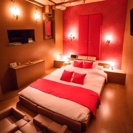 lovehotel, LHbedpanel, scenery, bed, indoors, lamp, couch, pillow, table, couch, rug, bedroom, television, pillow, phone, tissue box, box, night