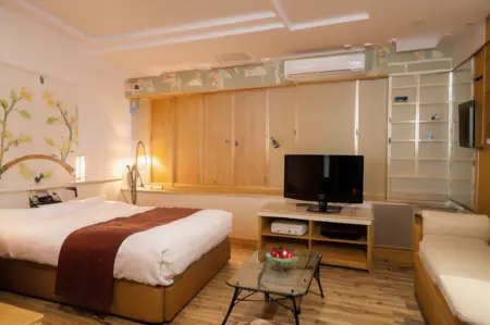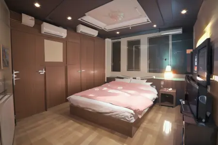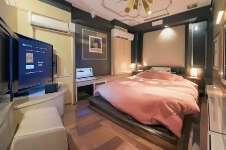 lovehotel, LHbedpanel, scenery, bed, indoors, lamp, couch, pillow, table, couch, rug, bedroom, television, pillow, phone, tissue box, box, night,