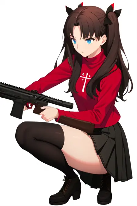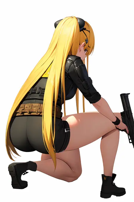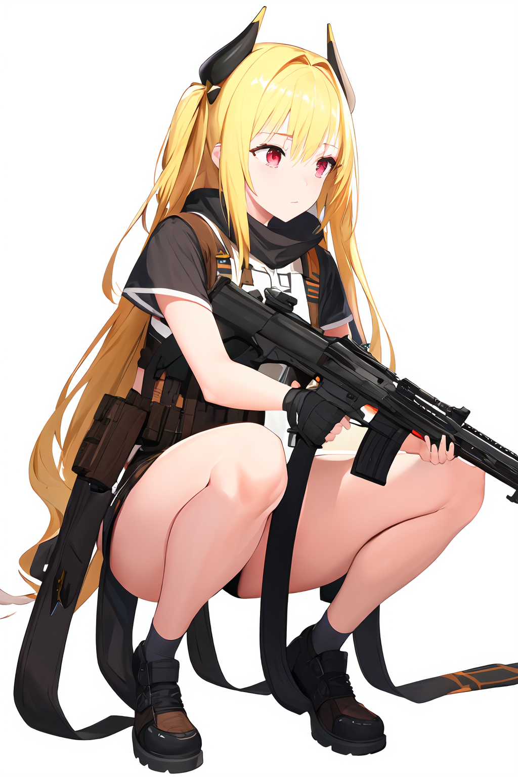 Type3: nikke_type3, しゃがみ姿, 太もも, [武器, 武器を持っている, 銃, 銃を持っている]
