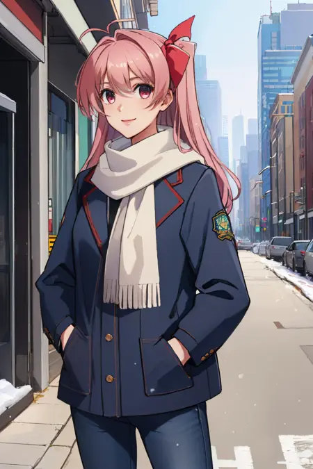 默认服装: 校服,西装外套,蝴蝶结,蓝色短裙,格子图案,黑色过膝袜