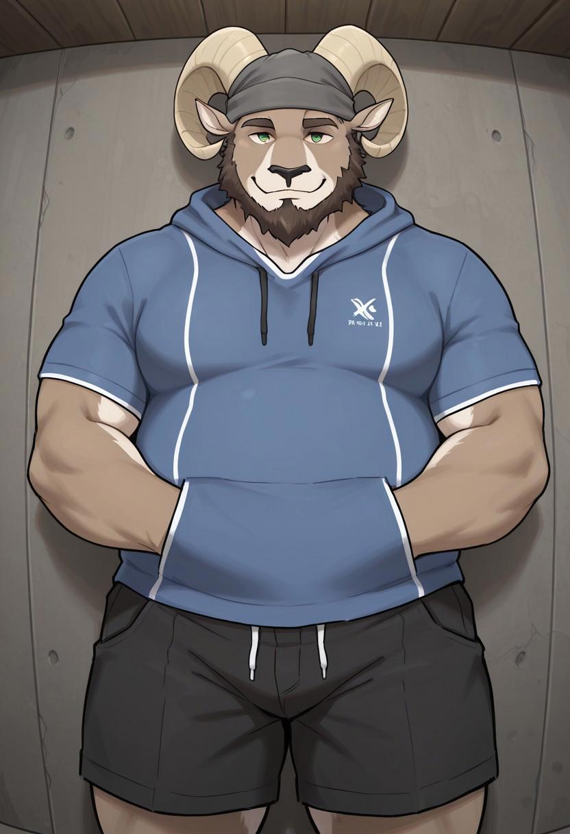 tags: anthro, ram, horns, green eyes, dull-brown fur, beige stomach, chubby, dark brown hair, beard, sideburns
