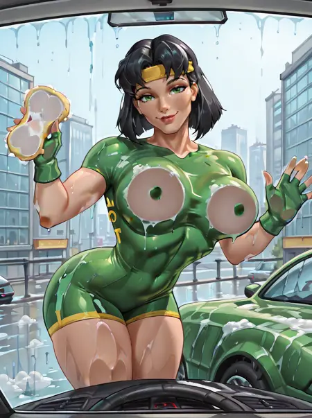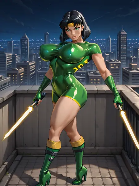 복장: 녹색 바디수트, 벌거벗은 허벅지, 녹색 하이힐 부츠, 손가락 없는 장갑, 노란 헤드밴드