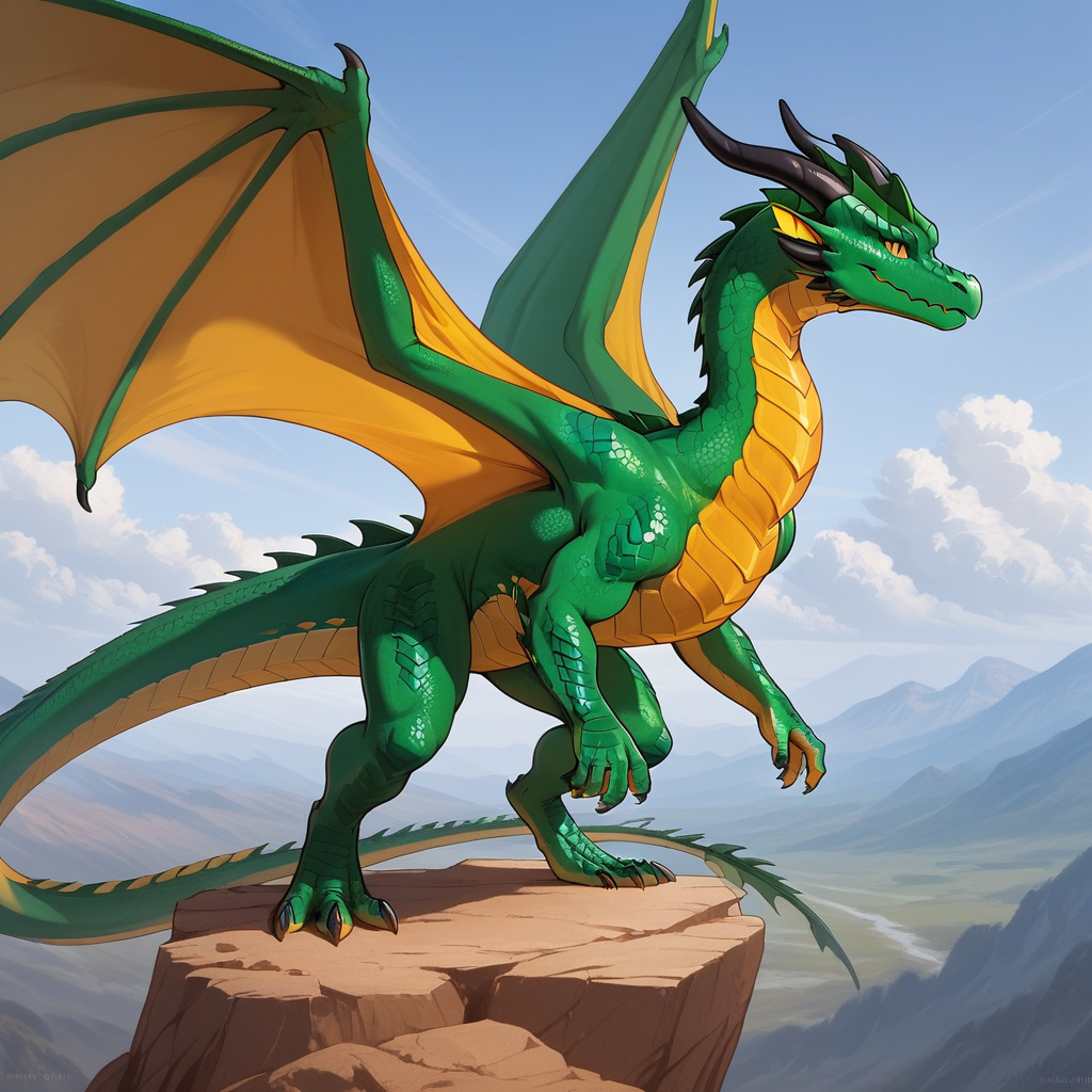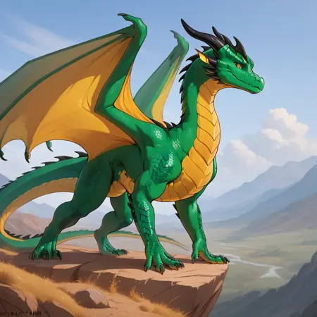 녹색 몸통과 노란 배를 가진 서양 드래곤을 생성합니다.