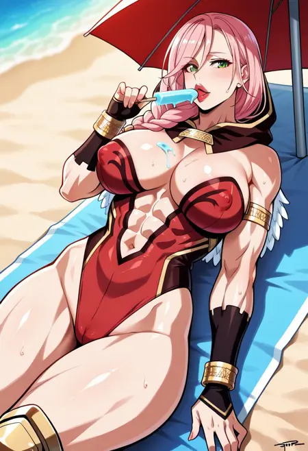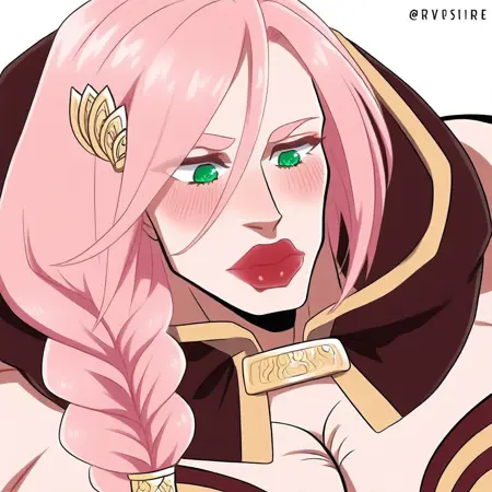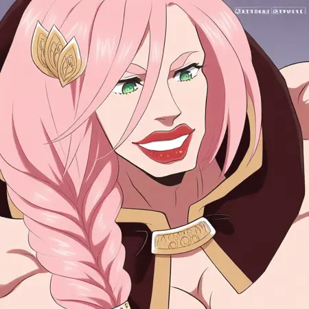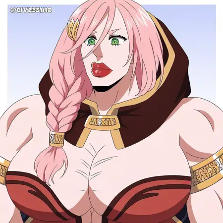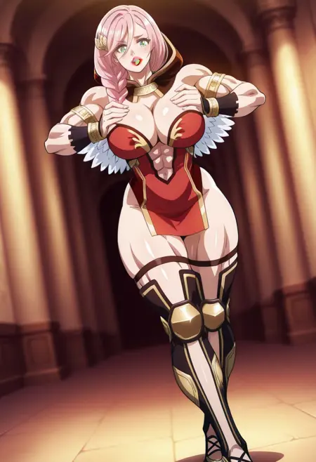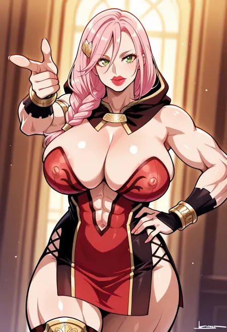 ThrudSnVRoR,1个女孩,单独,丰满女性,高个子女性,极其健壮的女性,方下巴,长发,粉红色头发,短单马尾,发夹,绿色眼睛,大嘴唇,红色口红,大乳房,乳沟,深红色斗篷带金色边线,红黑相间带金色边线的紧身胸衣,黑色布料紧身裤配白色金属护膝,红黑高跟鞋,黑色臂套,臂环,手镯,宽臀,二头肌,护臂,暴露的服装,腹肌,健壮的手臂,健壮的腿部,腹斜肌,背部有羽毛
