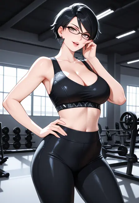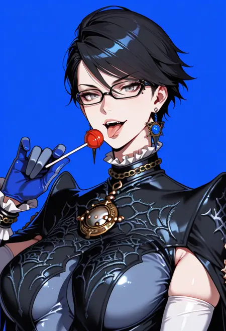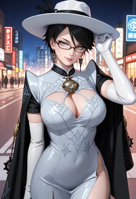 "BYN1WT,黑发,蜂窝发型,发带,嘴下有痣,眼镜,紧身衣,耳环,珠宝,黑色紧身衣,白色肘套,露胸剪裁,护身符"