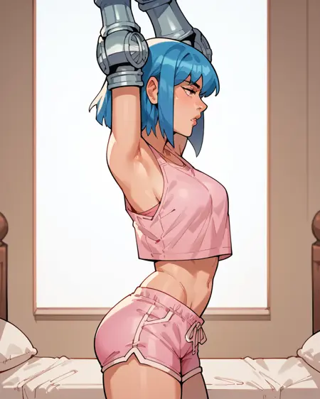 Triggers: marvelsurge, blue hair, crop top, midriff, pants, belt